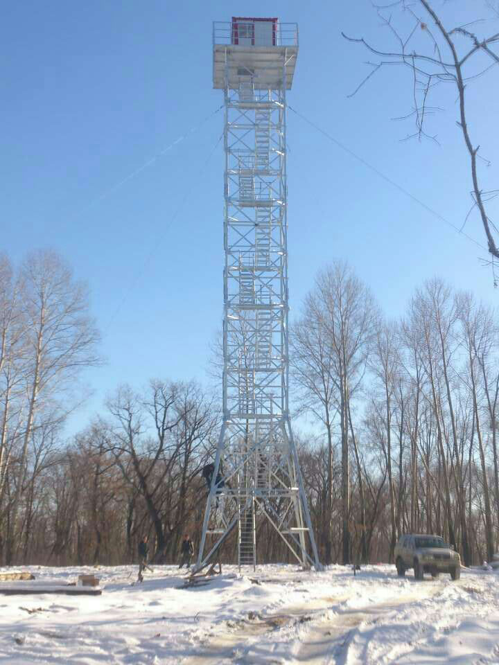 瞭望塔結構一般為鋼結構塔架,拆、裝方便。平面為四邊形自立式或拉線式。主體曲線一般為折線形,內部結構為交叉式。上部設工作平臺或值勤房。內部設有斜向爬梯或旋轉爬梯。