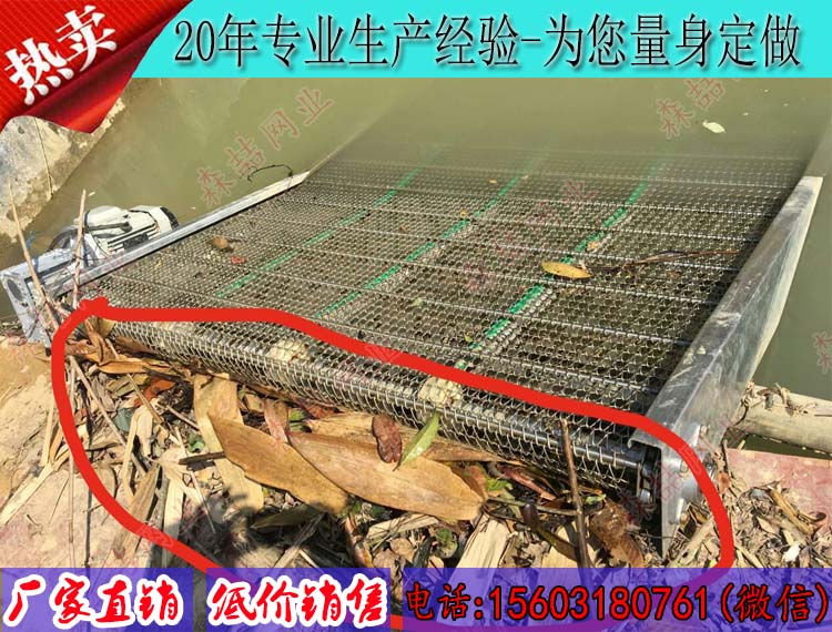 鏈條輸送帶是一種有不銹鋼絲編織而成的網狀輸送帶,這種輸送帶的網孔大小可根據具體需求定做,主要依靠網帶中的串桿來承載重量,在成本方面也比較低廉。根據李經理的需求只需定做一臺平板輸送機即可,傾斜放入水中便可將河道中的落葉以及其他異物輸送帶岸上,還不會影響河水的正常流動。
